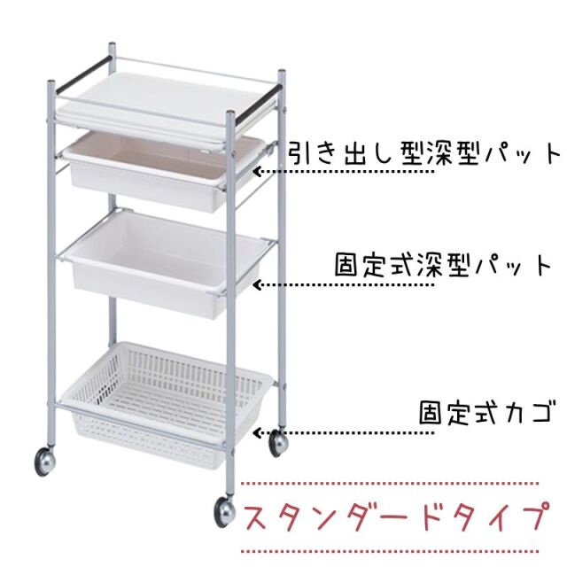 ■引き出し式深型パット1段、固定式深型パット1段、固定式カゴ1段付き