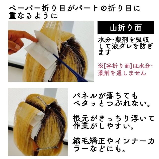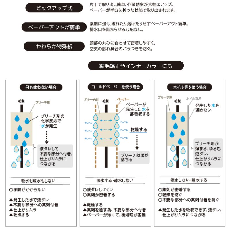 気を使うブリーチリタッチの仕上がり具合、作業効率、後片付けまで全力サポートする専用特殊ペーパー。 表の「吸水面」でブリーチ剤の化学反応で発生した水や余分な薬剤を吸収して、液ダレを防ぐ。裏の「疎水面」は薬剤を通さず、乾燥を防いで薬剤の効果を維持、2つのはたらきで不要な部分への薬剤付着を防ぎ、ムラのない仕上がりに。 縮毛矯正やインナーカラーなどにもおすすめ。 ※表と裏で効果の違う特殊ペーパーです。 ・ピックアップ式で、片手でも取り出し簡単で作業効率がアップ。時間勝負の施術をフォロー ・やわらか特殊紙で、頭部の丸みに合わせて密着しやすく、空気の触れ具合のばらつきを防ぐ ・薬剤に強く、破れたり溶けたりしません