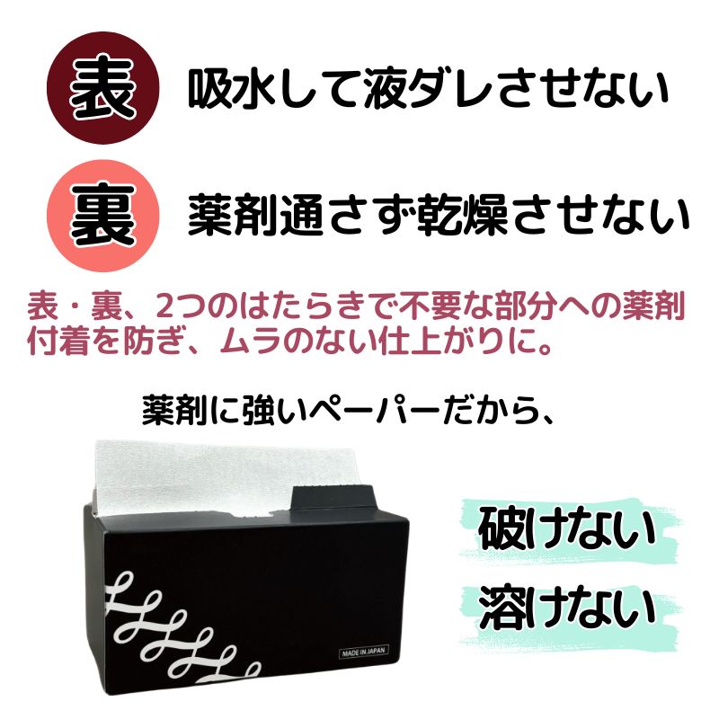表の「吸水面」でブリーチ剤の化学反応で発生した水や余分な薬剤を吸収して、液ダレを防ぎ、裏の「疎水面」は薬剤を通さず、乾燥を防いで薬剤の効果を維持、2つのはたらきで不要な部分への薬剤付着を防ぎ、ムラのない仕上がりに。