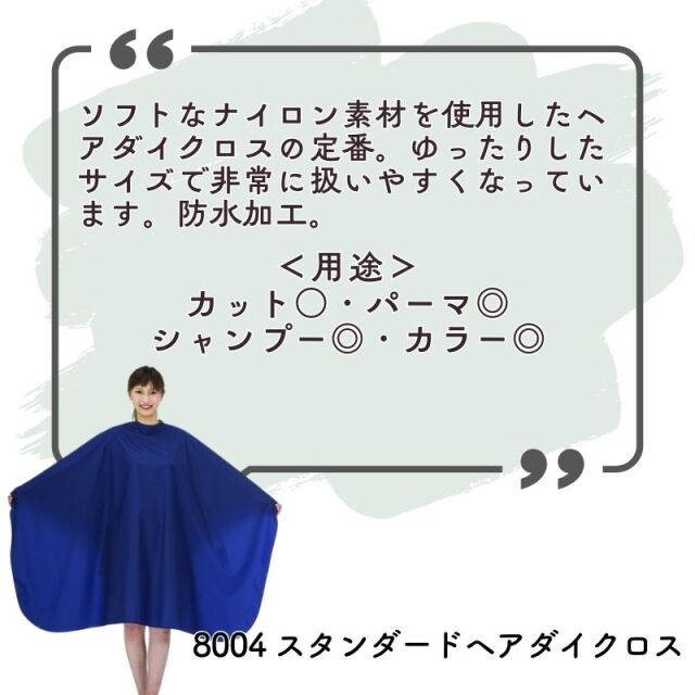 ソフトなナイロン素材を使用したヘアダイクロス。 ゆったりしたサイズ。 カット・パーマ・シャンプー・カラー対応。