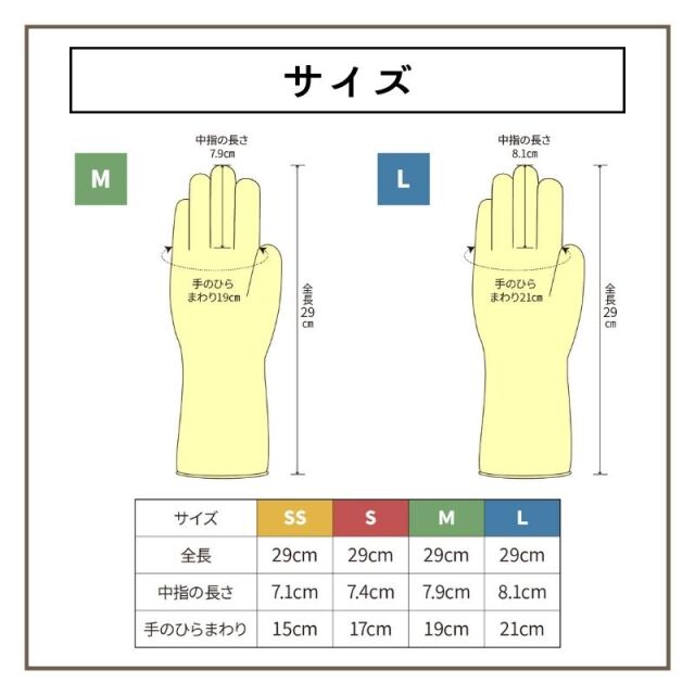 ・L:全長29cm、手のひら周り21cm、中指の長さ8.1cm