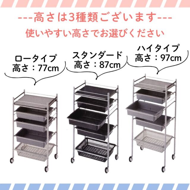 シンプルなデザイン、収納力の高いワゴンです。 引き出し式パット3段、固定式カゴ1段となっております。 床にやさしく、髪の毛が絡みにくいポールキャスターを使用しています。 ●サイズ:高さ87cm×幅43cm×奥行き30cm ●カラー:ホワイト、ブラック、ブラウン、グレーよりお選びください。 ●スタンダード(高さ87cm) ●日本製