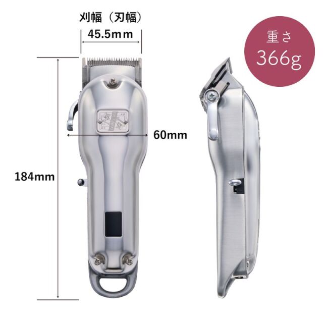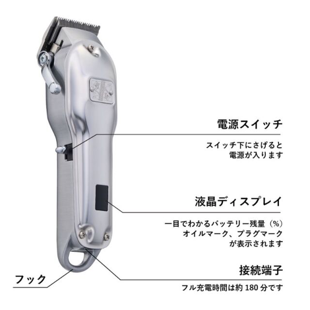 切れ味、スタイル、使い心地、全てを極めたメタルクリッパー。 目を引くデザイン性と、ハイパワーで安定した使い心地です。 ◎無段階調整レバーで0.8~1.8mmまで刈高を指の感覚で調整可能。 フェードスタイルの繊細な技術をサポートします。 ・耐久性のあるステンレス刃で滑らかな切れ味を実現 ・電池残量に関係なく回転数を維持。大容量の2500mAhで連続使用時間180分。 ・液晶ディスプレイにバッテリー残量が表示。充電忘れを防止します。 <ご注意> 充電にはUSBアダプター(定格出力DC5A 1A)が必要になります。 <仕様> 入力電源:DC5V 1A 刈高:約0.8mm~1.8mm サイズ:184×60×46mm コード長:約1.0m 材質:ステンレス、アルミ 使用電池:リチウムイオン電池(2500mAh) 充電時間:約180分 連続使用時間:約180分 付属品:アタッチメント4種(1.5mm/3mm/4.5mm/6mm)、ブレードカバー、掃除ブラシ、USBケーブル、オイル