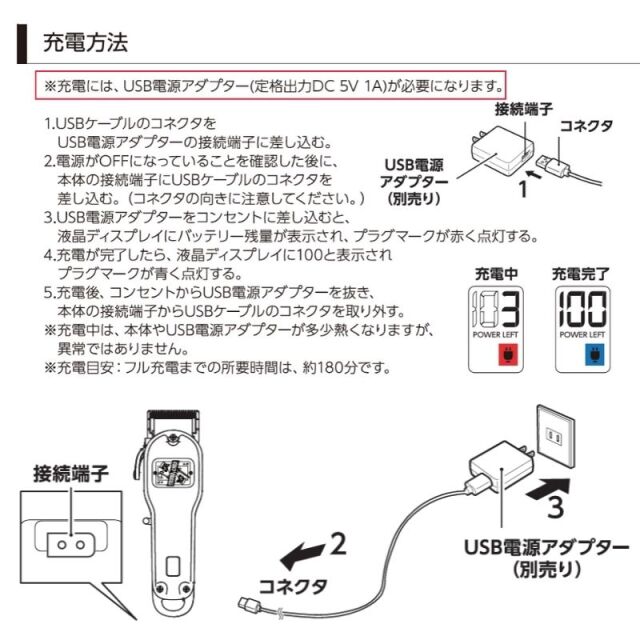 充電にはUSBアダプター(定格出力DC5A 1A)が必要になります。
