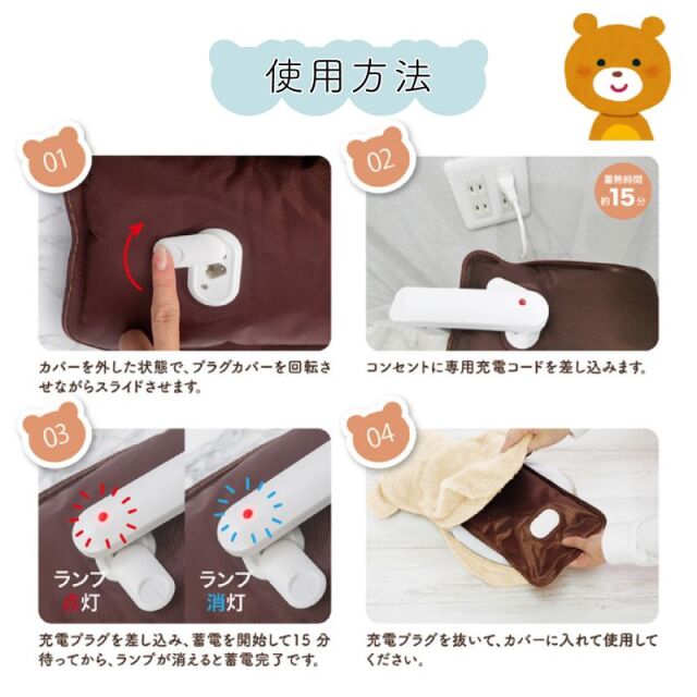 [ぽかベア・ミルキー][お湯の入れ替え不要、使いたいとき蓄熱] 面倒なお湯の交換が不要な充電蓄熱式湯たんぽです。 使いたいときに約15分間の蓄熱をするだけ。繰り返し使用できます。 湯たんぽ本体をクマ型カバーに入れてお使いください。 自宅、オフィス、車など様々な場所でお使いいただけます。 蓄熱時間:約15分(環境により異なります) 最高温度:約75℃(蓄熱時75℃到達時点で自動加熱停止) 保温時間:最大約19時間(室温25度であんかとして使用した場合/環境や使用方法により異なります) PSE認証済で安心してお使いいただけます。