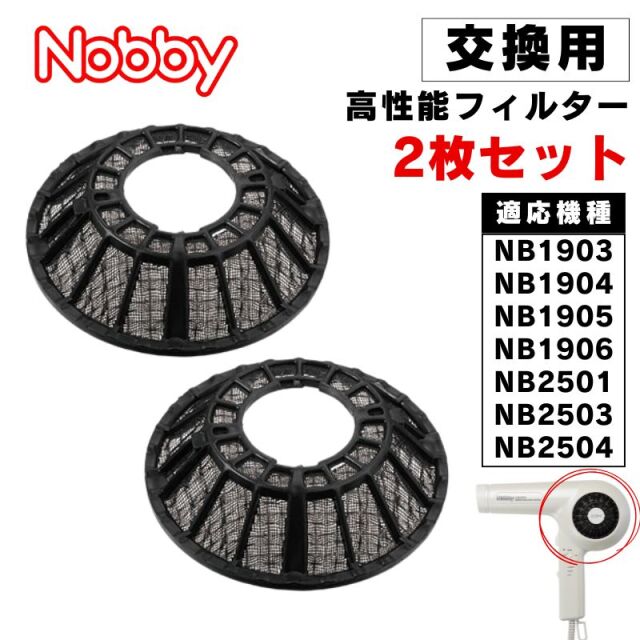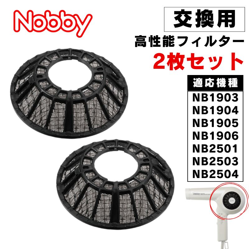 Nobby/ノビードライヤー専用の高性能フィルター。 フィルター部分のお取り替えに。 【適応機種】 NB1903・NB1904・NB1905・NB1906・NB2501・NB2503・NB2504・OFR01 ●内容量:2枚セット ●色:ブラック