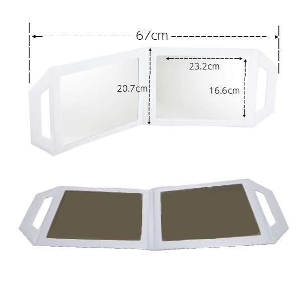 ヘアサロン必需品。散髪カット・セット後のチェックに。2面式鏡。美容室・サロンで使われているプロの美容師用ミラー。美容院/美容室/理髪店/理容室/美容師/ヘアスタイル/チェック/サロンミラー/業務用/バーバー/おしゃれ/セルフカット/散髪/仕上がり