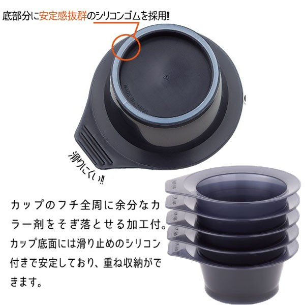 持ち手部分にも持ちやすく滑りにくい加工を施してあり、カップ内部の底面には5cm×5cmの目盛がついて いるのでカラー剤を測る目安に最適です。