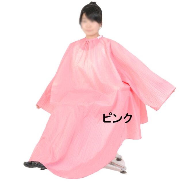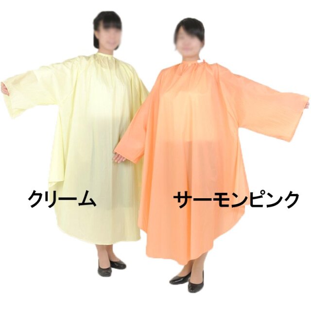 理美容室で使用される袖付きクロス。胴回り320cmのワイドサイズでソファーチェアもカバーします。切った髪がサラッと落ちるナイロンシワ加工生地。前・後身ごろゆったりサイズで大きなイスでも、背割れの心配がありません。美容室/理容室/セルフカット/ワインディング/コールド/パーマ/散髪ケープ