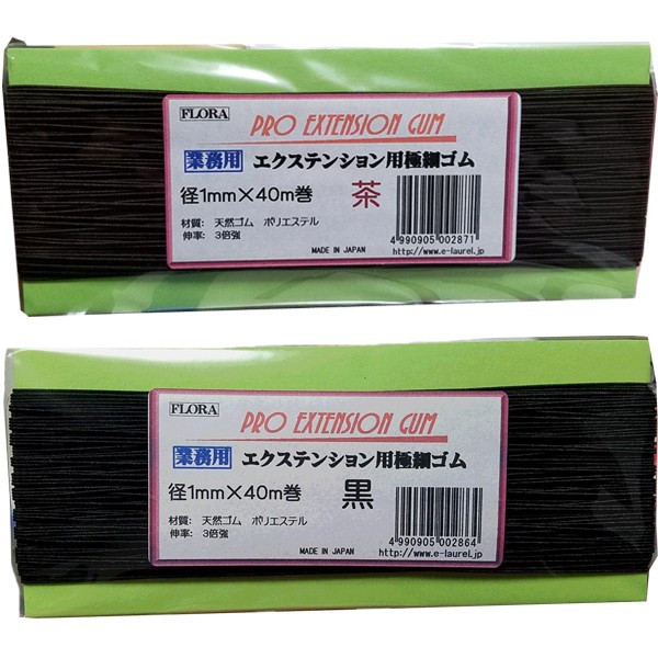 エクステンション専用ゴム。伸率3倍強で強度もあり、編込みに最適なゴムになります。三つ編みや四つ編みでエクステを取付け後に糸ゴムで結び止めます。●材質:天然ゴム、ポリエステル●直径1mm×40m巻●日本製●カラー黒・茶●フローラ FLORA。エクステ/エクステンション/編み込み/地毛/前髪/業務用