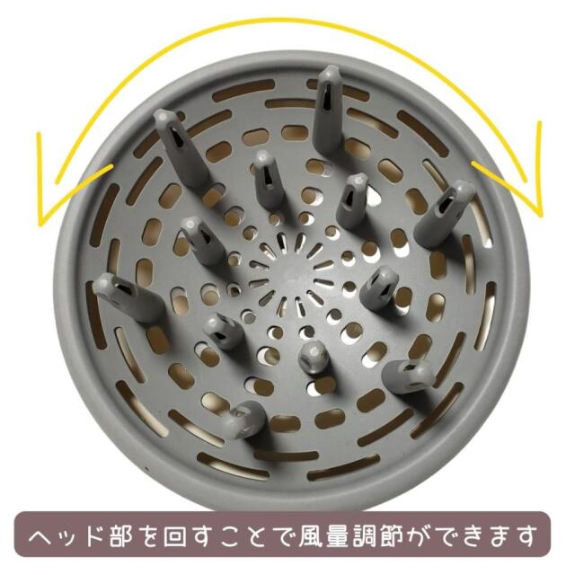 ドライヤーの風を分散・拡散させ、ヘアスタイルがふんわりと仕上がります。 お手持ちのドライヤーの吹出口に取り付けるだけで簡単にお使いいただけます! ヘッド部を回すことで風量調節ができます。 ドライヤー ブロー ウェーブ パーマ ヘアアレンジ 美容室 理容室 理髪店 ヘアサロン 美容院 美容師 プロ用