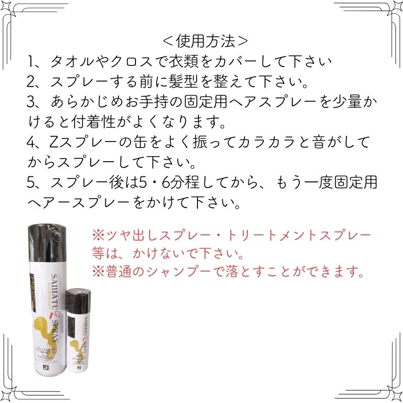シャンプーで落ちる、薄毛部分や白髪にスプレーするだけ。 ミクロで自然な黒い微粒子が髪に絡みつき薄毛や白髪が目立ちにくくなりボリュームアップします。 (携帯用ミニスプレー付) ●セット内容:彩髪Zスプレー280mL+携帯用ミニスプレー ●色:自然色(黒)、ダークブラウンよりお選びください ※ツヤ出しスプレー・トリートメントスプレー等は、かけないで下さい。 ※普通のシャンプーで落とせます。