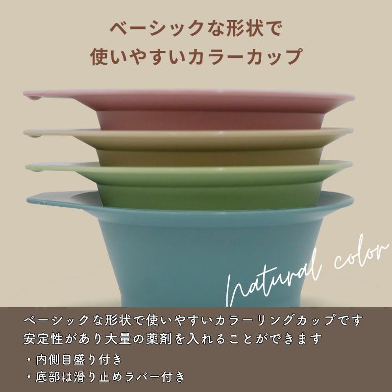 ベーシックな形状で使いやすいカラーリングカップです。 安定性があり大量の薬剤を入れることができます。 くすみ系カラー4色となっております。 ・内側目盛り付き ・底部は滑り止めラバー付き