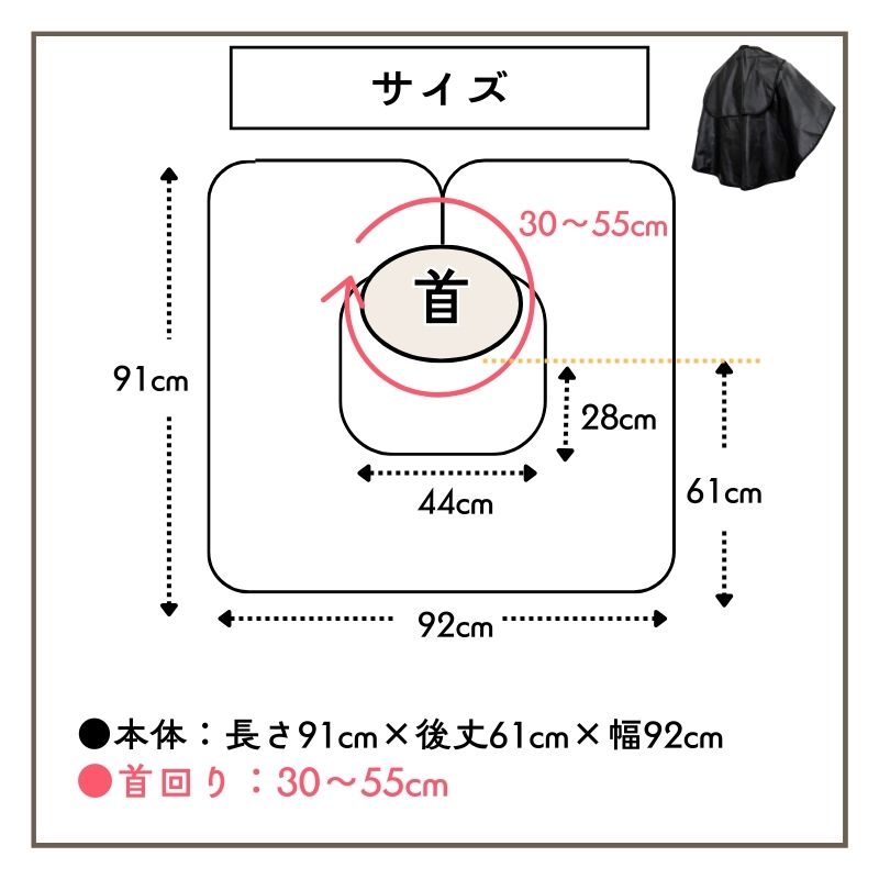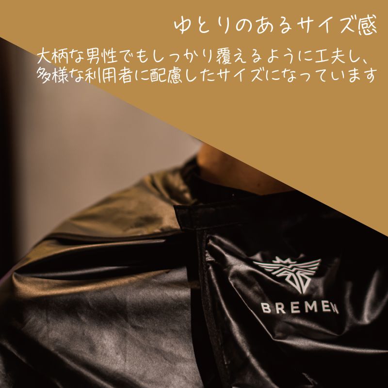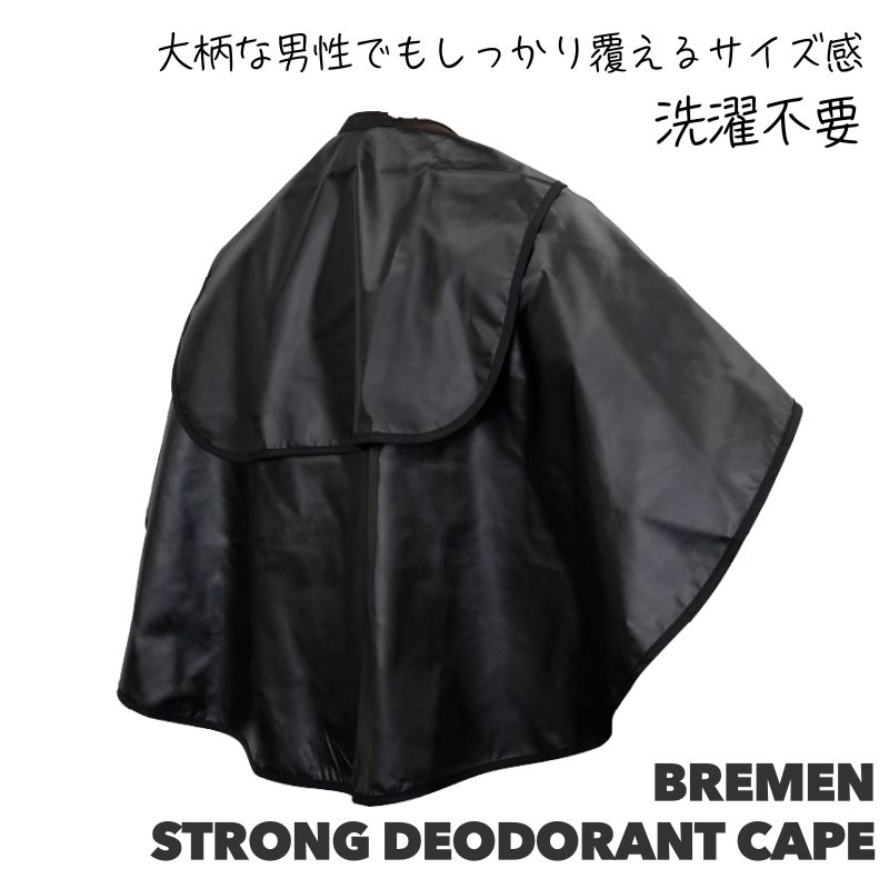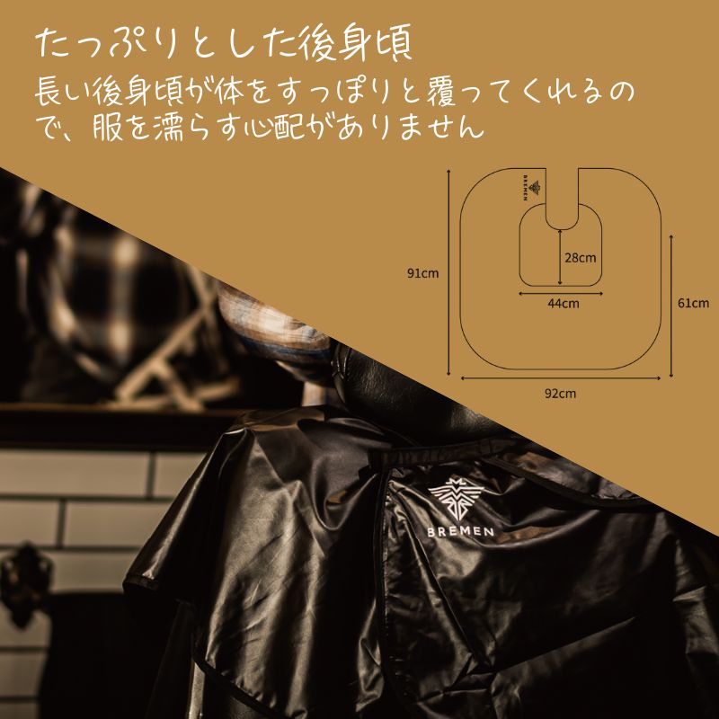 [ハードな日常に耐える、タフな仕様] 防臭性の高いEVAをポリエステルに融着させることで、防臭効果を維持しながら、破れにくい丈夫さを実現。 大柄な男性でもしっかり覆えるようなゆとりのあるサイズ感、多様な利用者に配慮したサイズに仕上げています。 長い後身頃が体をすっぽりと覆ってくれるので、服を濡らす心配がありません。 [洗濯は不要] EVAコーティングなので、臭いの原因になる皮脂がケープに浸透しません。 お手入れは拭き取りのみでOK!水洗いをしたい場合は手洗いしてください。 ●サイズ:長さ91cm×後丈61cm×幅92cm ●首回りサイズ:30~55cm ●素材:EVAコーティング、ポリエステル