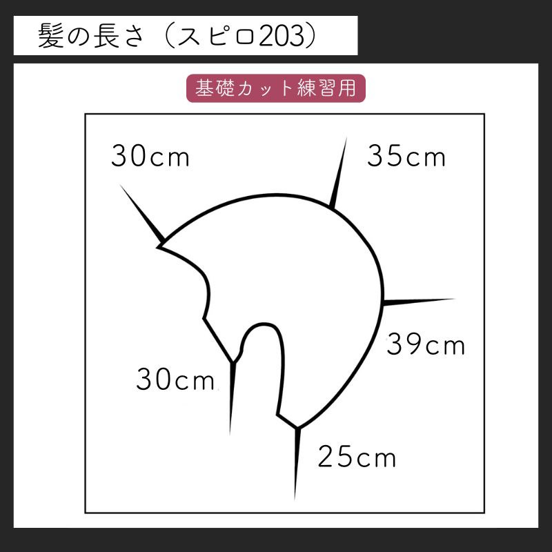 ●前髪:30cm、ゴールデンポイント:35cm、後頭部:39cm、ネープ:25cm、サイド:30cm