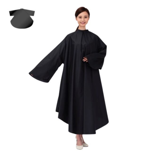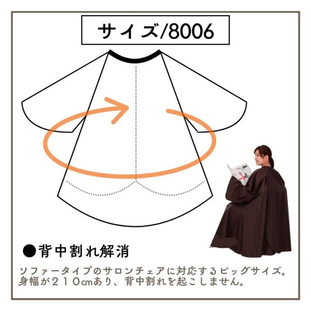 ソファータイプのサロンチェア対応のビッグ袖付ヘアダイクロス。 身幅が210cmあり、前かがみになっても背中割れを起こさず、雑誌を読んだりドリンクサービス時でも安心です。 袖丈が85cmあり、お客様の袖口を汚す心配がありません。