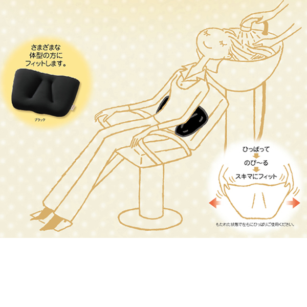 椅子の背に立てかけ、もたれた状態で左右にひっぱるだけでフィット。体の動きにクッション形が変化し、様々な体系の方に合わせ、椅子と体の隙間を埋めます。やさしく腰を包み込み、腰への負担を軽減。まくら/クッション/サロン備品/美容院/サロン/腰用/サロンチェア/理髪店/理容室/バーバー/ヘアサロン