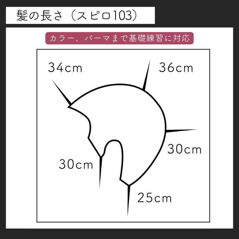 ●前髪:34cm、ゴールデンポイント:36cm、後頭部:30cm、ネープ:25cm、サイド:30cm